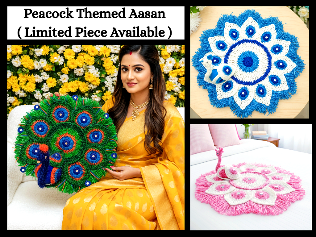 Handmade Crocheted Peacock-Inspired Aasan for Kanha Ji | Elegant Thalposh | Sacred Table Cover & Home Decor