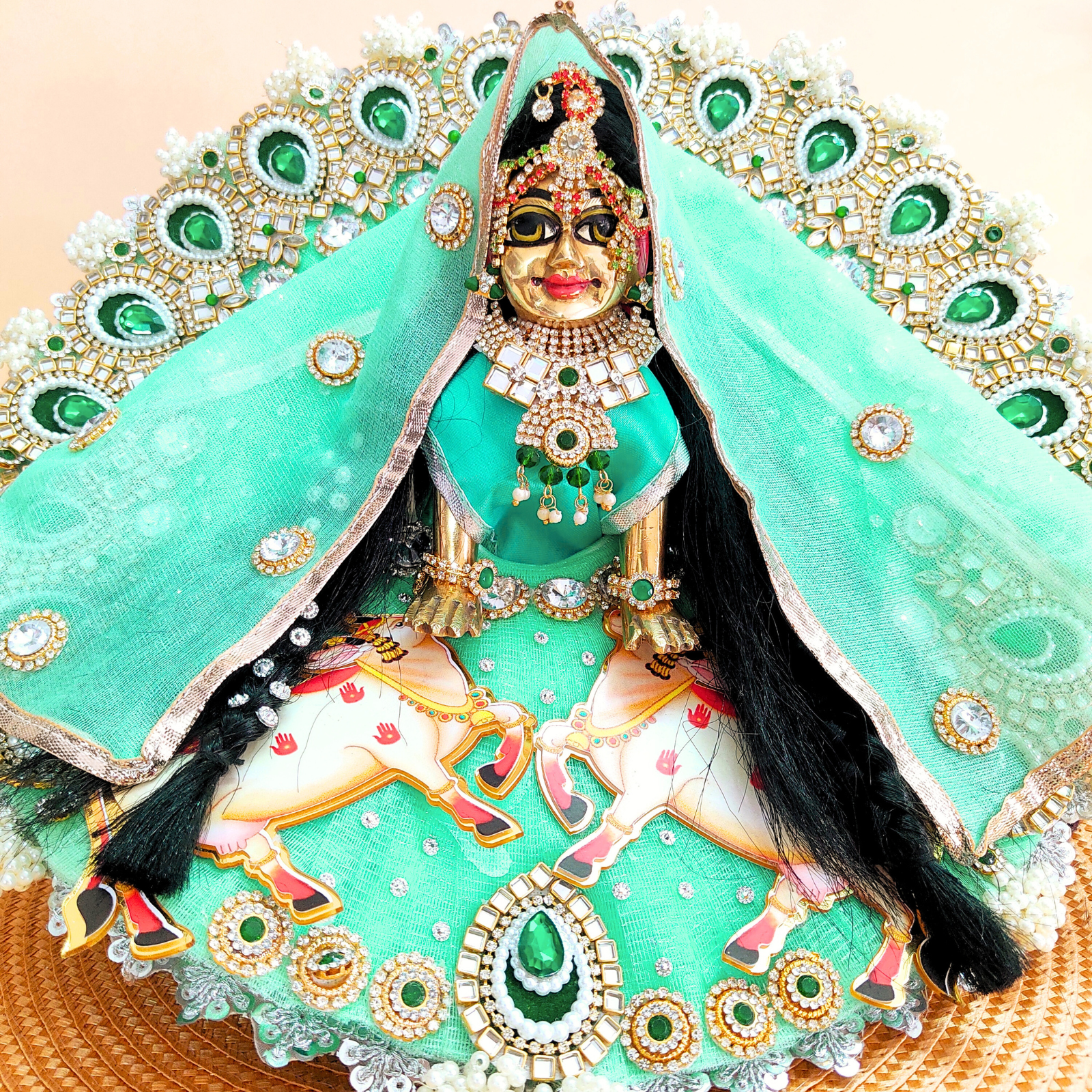 Celebrate the sacred bond of Krishna and Gau Mata with this Divine Cow-Themed Sea Green Dress for Radha Rani, beautifully designed for Janmashtami. Featuring handmade heavy patches, a matching Dupatta,, and a complete Shringar set, this poshak honors Krishna as Gopal – the loving protector of cows. A graceful tribute to Vrindavan’s divine charm.