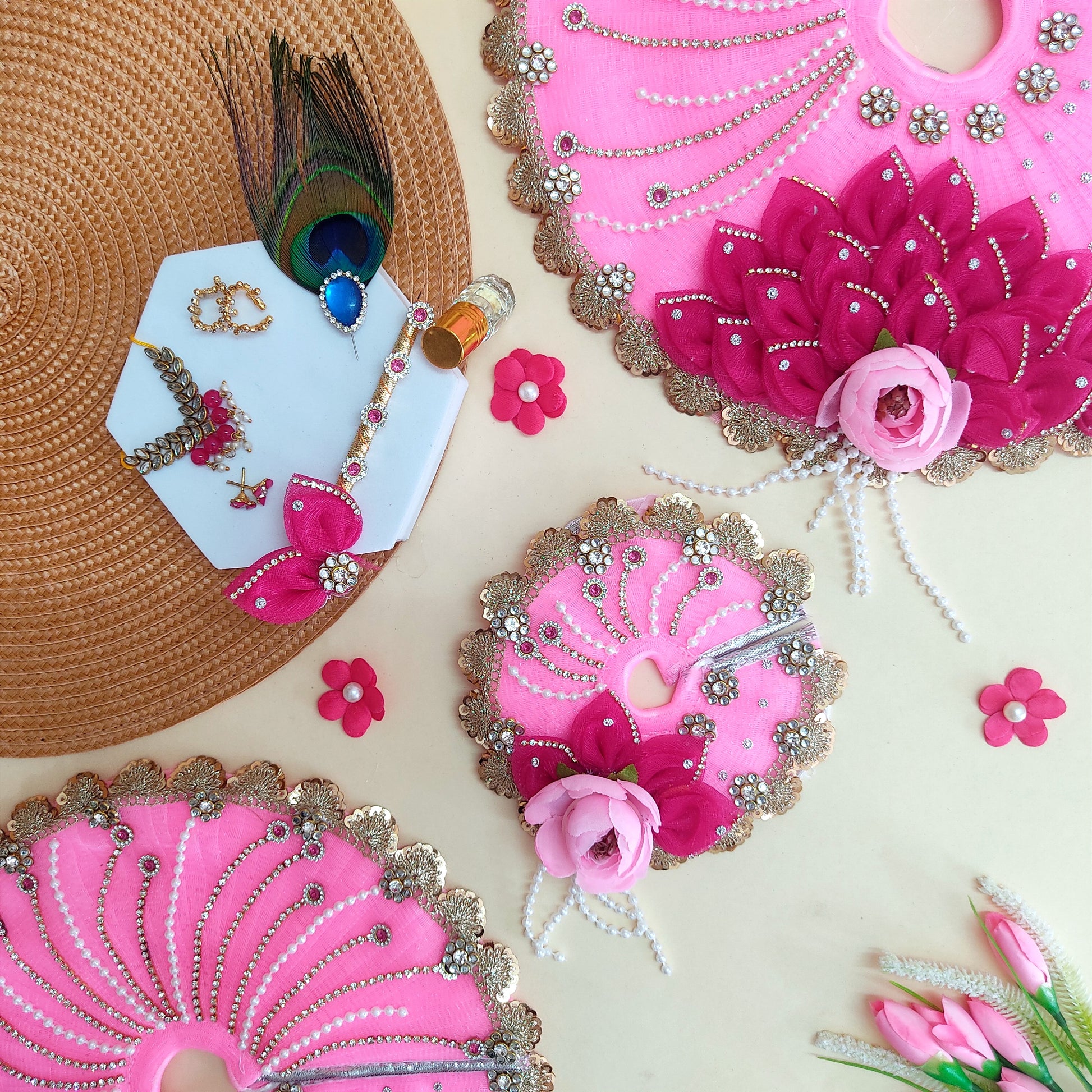 Diwali Special Divine Light Pink & Pink Kanha Ji Poshak with Diamond Lace & Floral Accents with Mukut, Pataka Set, Bansuri & Full Shringar Set