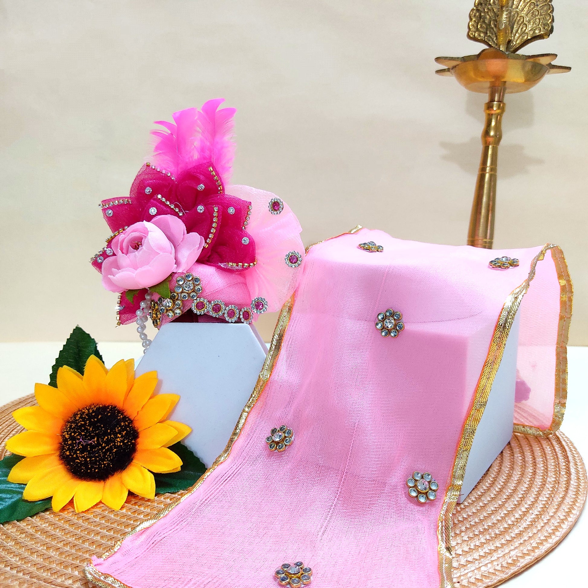 Adorn your beloved Kanha Ji in vibrant tradition with this Light Pink & Pink Poshak, beautifully designed with diamond lace work, delicate petals, and floral accents. Paired with a matching heavy Mukut and a complete Shringar set, this ensemble adds divine beauty and festive charm to every darshan. Available in three stunning colors.