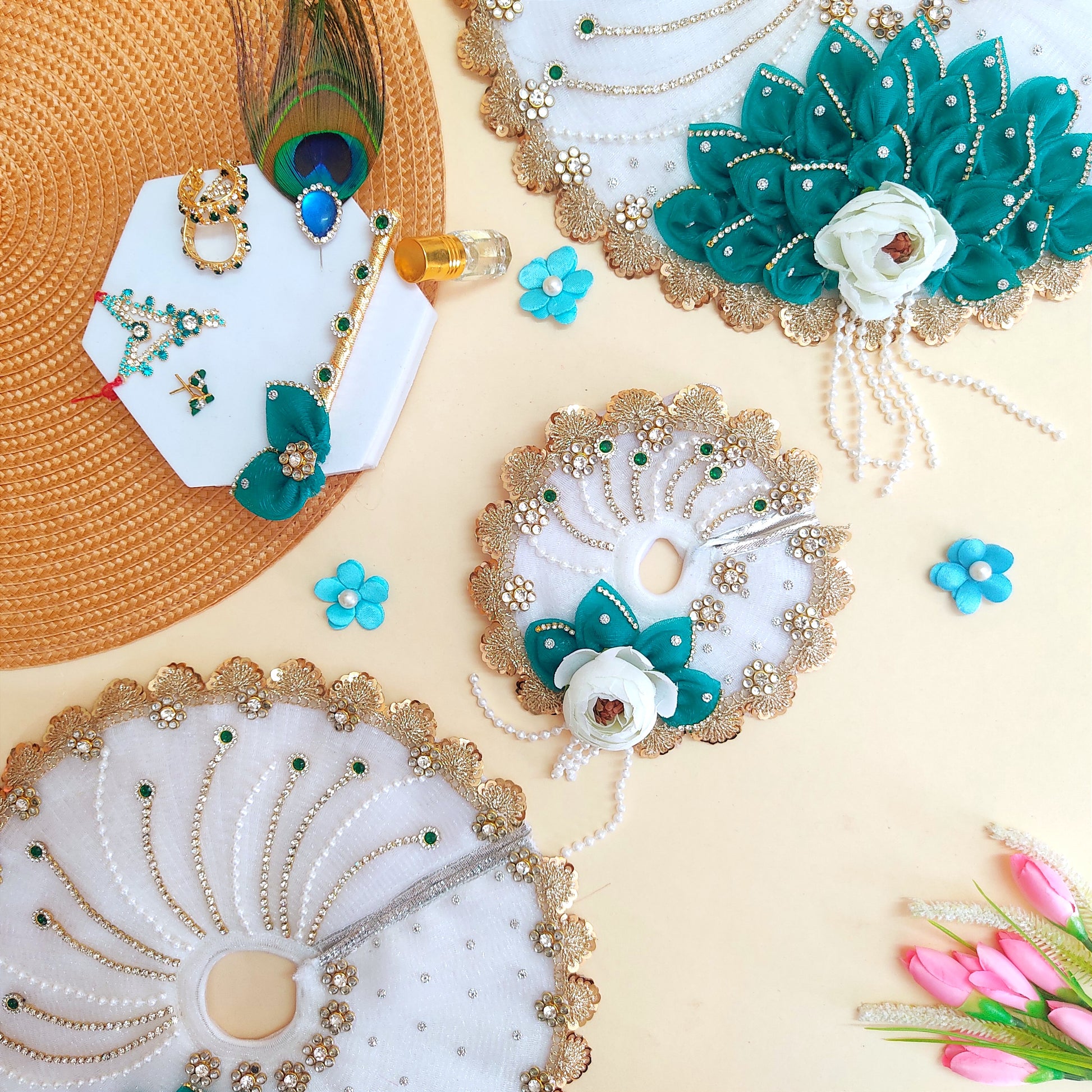 Adorn your beloved Kanha Ji in vibrant tradition with this Teal & White Poshak, beautifully designed with diamond lace work, delicate petals, and floral accents. Paired with a matching heavy Mukut and a complete Shringar set, this ensemble adds divine beauty and festive charm to every darshan. Available in three stunning colors.