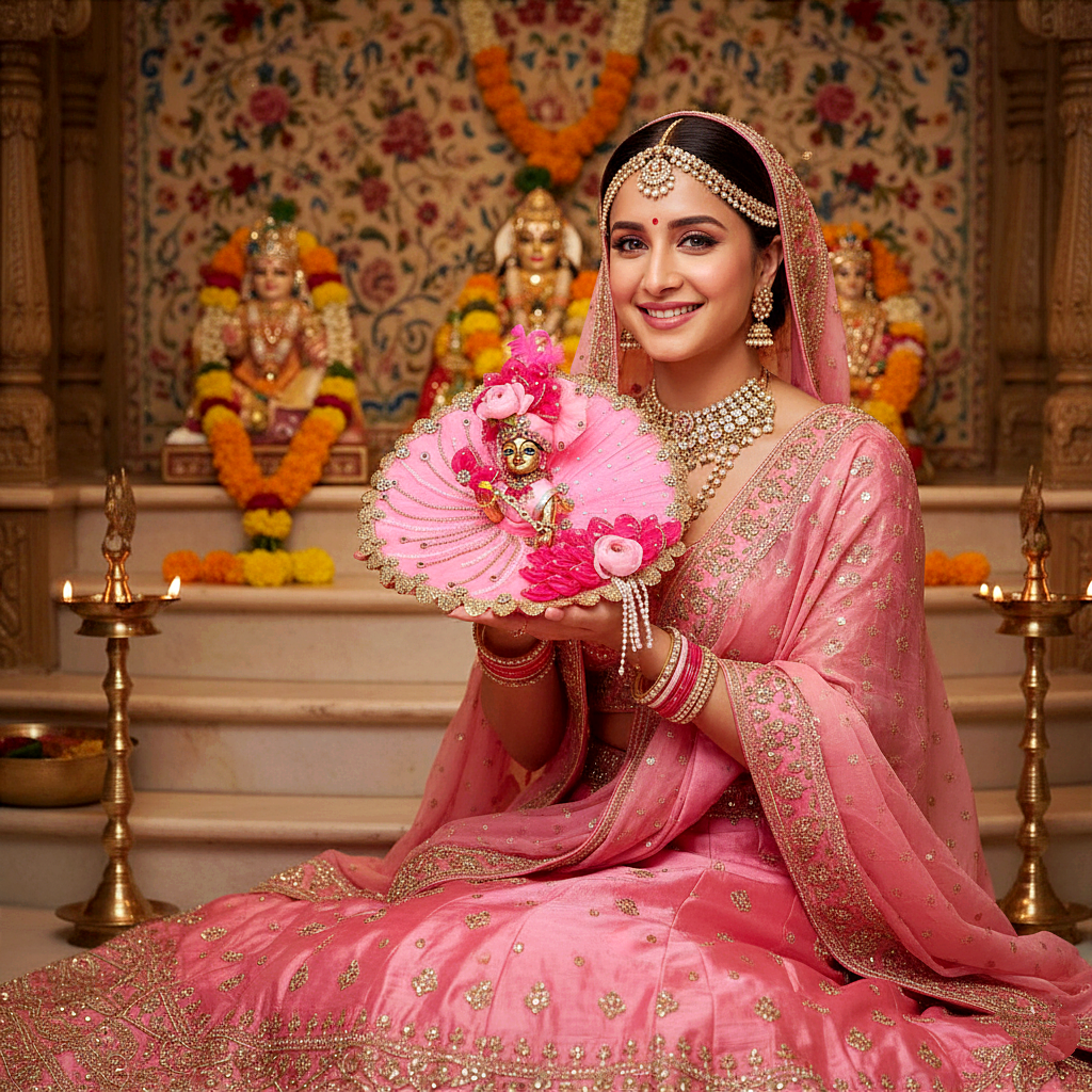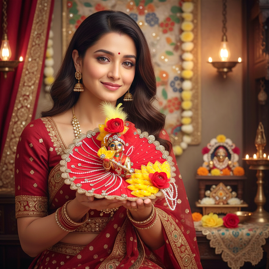 Includes — Handcrafted Heavy Poshak, Mukut for Kanhaji/Chunri for Radha Rani, Matching Bansuri, Diwali Pataka Set (5 Pcs) and a Surprise Gift.