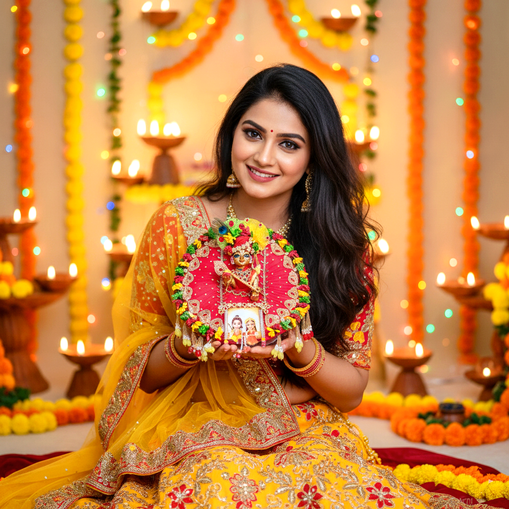 Full Shringar (10-Piece Grand Set) - Includes: Handcrafted Heavy Poshak, Mukut or Chunri, Matching Bansuri, Necklace, Bangles, Earrings, Aromatic Perfume, Peacock Kalgi, Protective Dress Cover, and a Surprise Gift.
