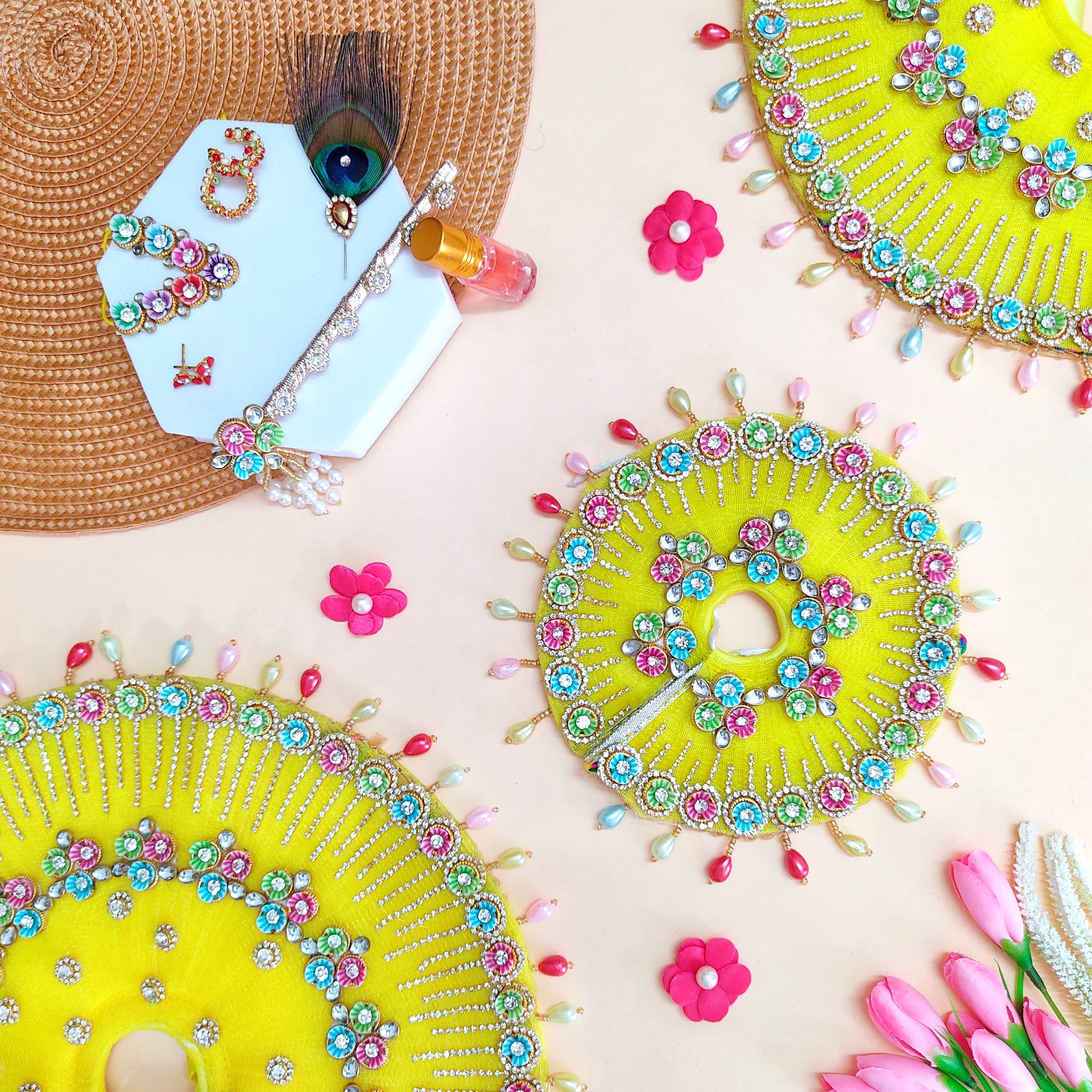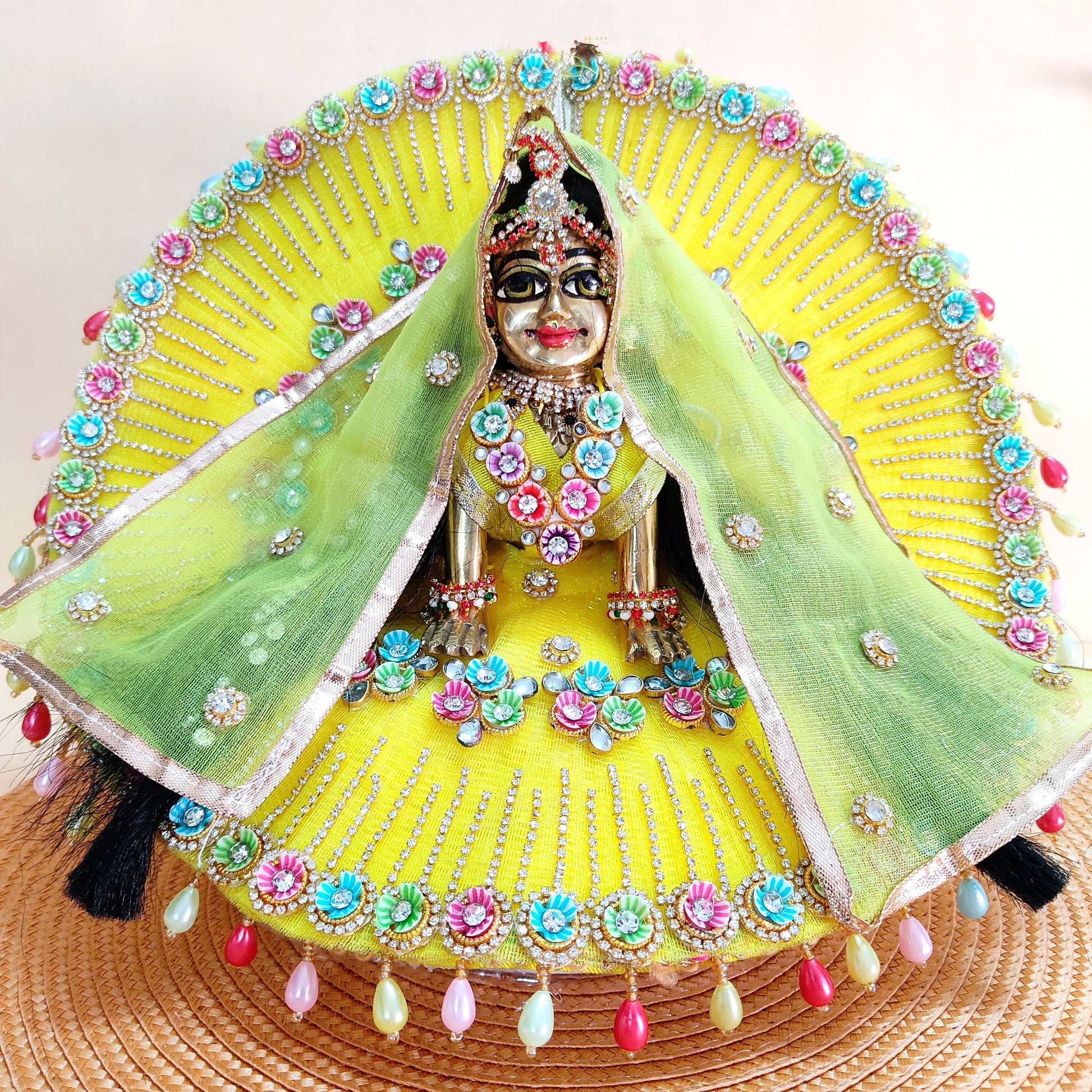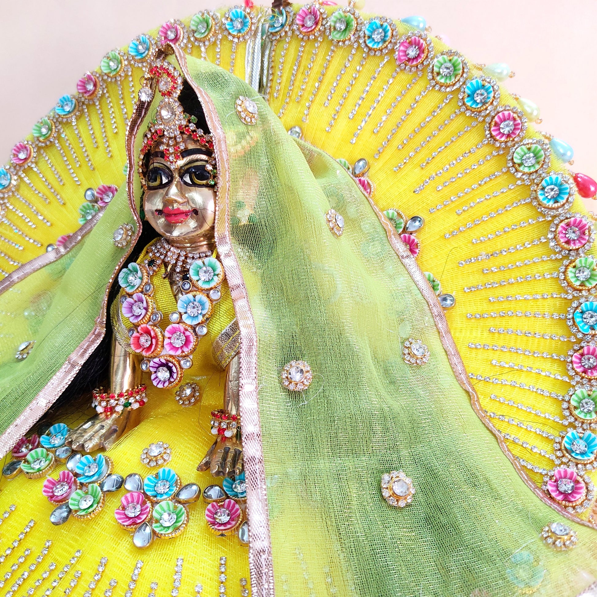 Adorn your beloved Radha Rani in divine elegance with this Lemon Yellow Designer Outfit, featuring vibrant multicolor floral work, delicate diamond chain detailing, and soft multicolor lace that adds charm to every darshan. This ensemble is paired with a matching Chunri and a complete Shringar set, making it a perfect choice for festivals, Janmashtami, or daily worship. Available in two beautiful color options, each dress is crafted with devotion to bring out the radiant beauty.