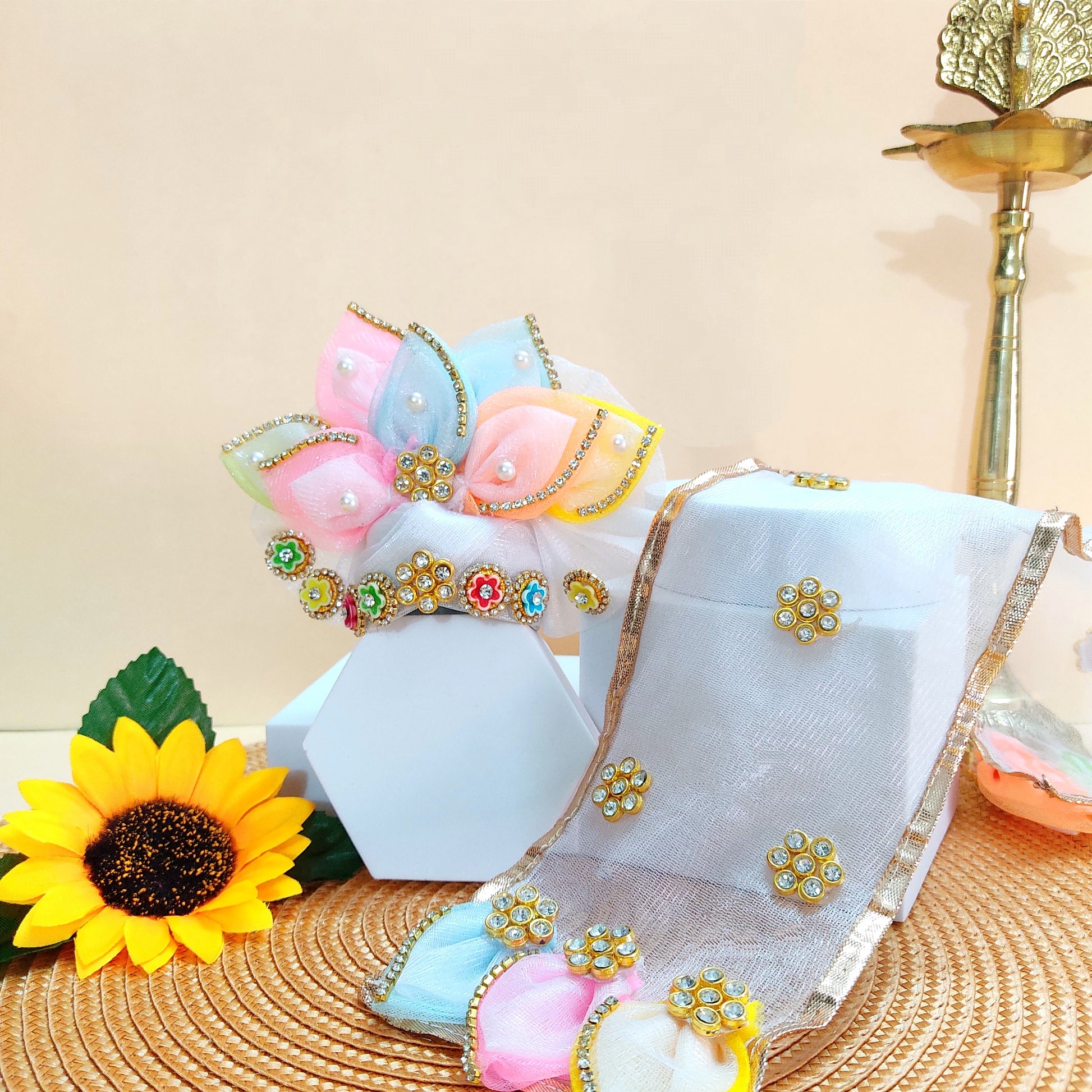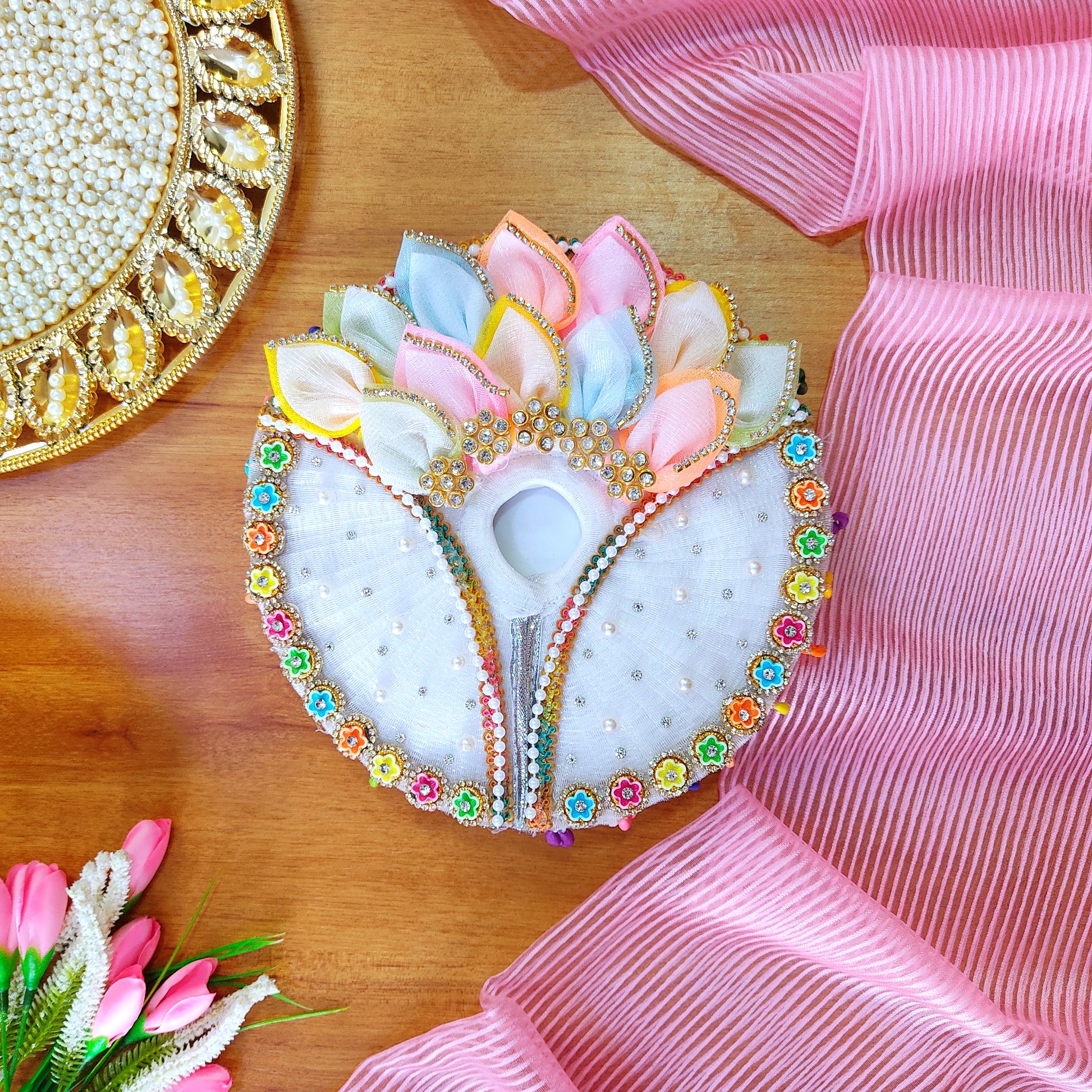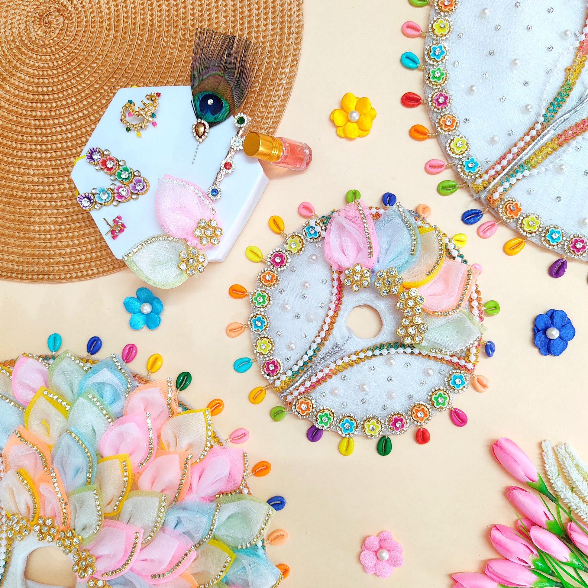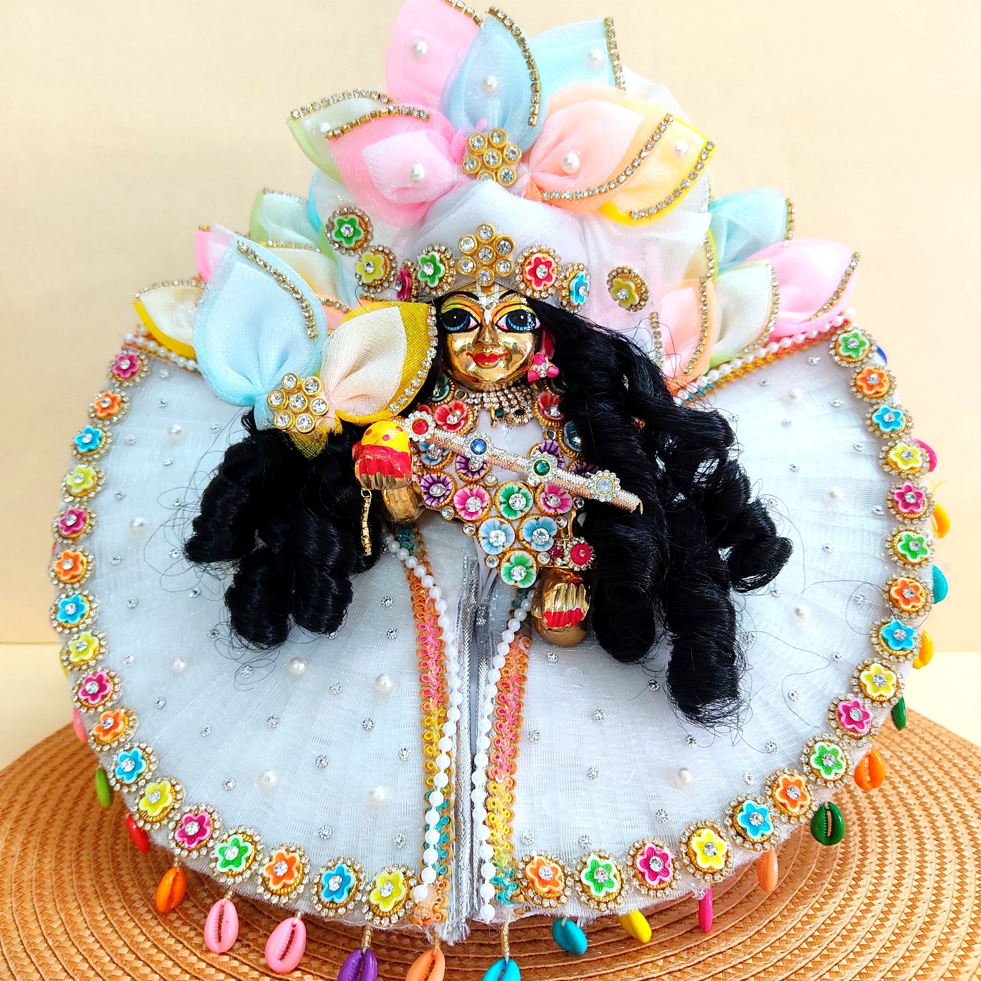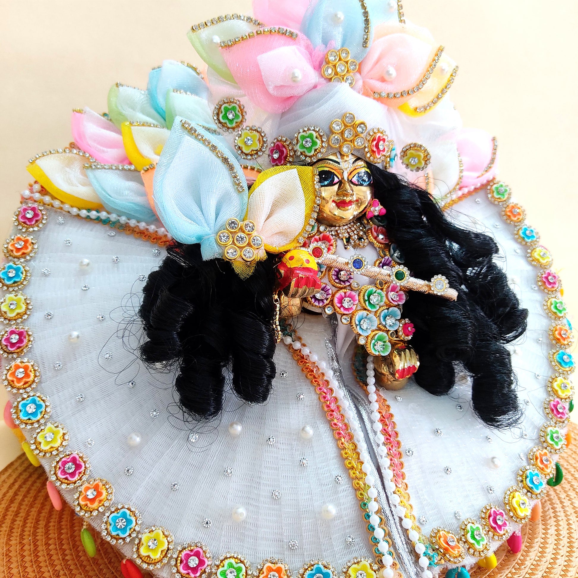 Sharad Purnima Special White Krishna Poshak – Multicolor Petal Work & Lace Dress with Mukut, Bansuri, Full Shringar Set & a Surprise Gift