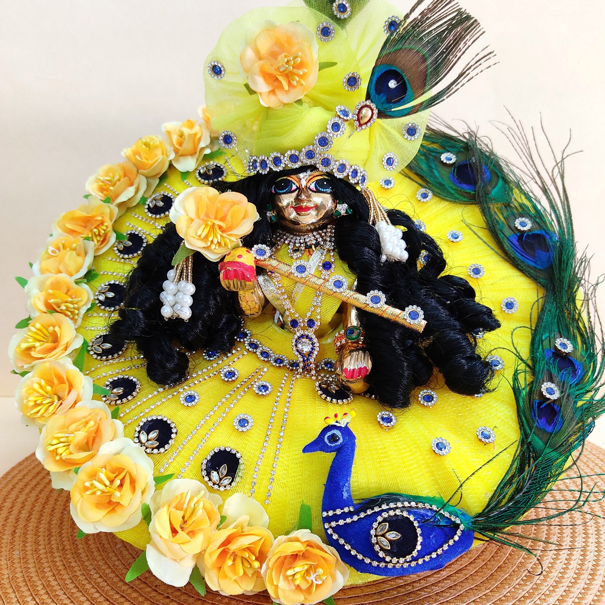 Inspired by the divine beauty of Vrindavan’s blooming flowers and dancing peacocks, this Peacock Theme Dress in radiant Green Color is a tribute to Kanha Ji’s playful grace. Adorned with real peacock feathers and handcrafted floral accents, this poshak reflects both vibrance and devotion. Paired with a matching Mukut and a complete Shringar set, it’s perfect for Diwali , festive occasions, or daily darshan. Available in two stunning colors, this dress is designed to make your beloved Laddu Gopal shine in divine elegance.