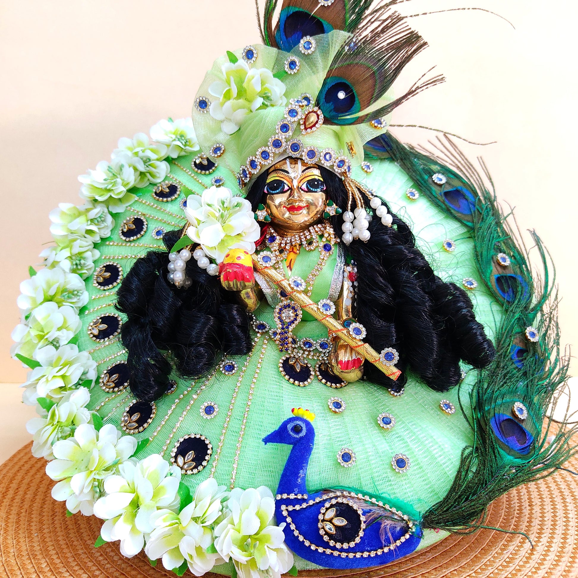 Radiant Green Color With Peacock Theme Dress for Kanha Ji – Real Peacock Feathers & Floral Work with Mukut, Patakha Set, Bansuri & Full Shringar Set