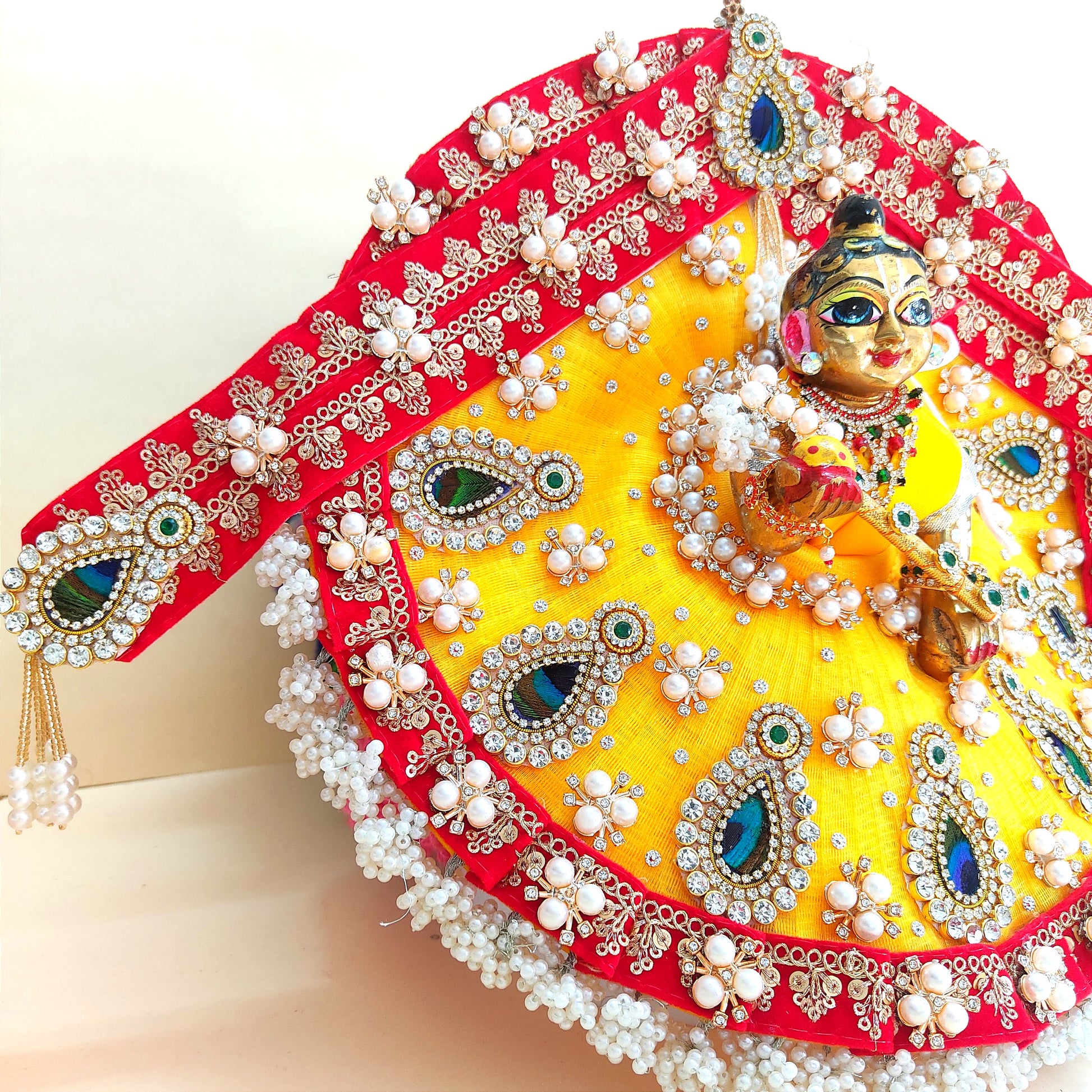 Bring divine vibrance to your Laddu Gopal's roop with this Designer Red and Yellow Poshak, crafted with heavy styling, radiant colors, and intricate peacock patchwork that symbolizes Krishna’s eternal bond with nature and beauty. This unique design is paired with a matching Mukut and a complete Shringar set, making it a perfect choice for Diwali, festive celebrations, or your home temple's daily darshan. Every detail reflects devotion, elegance, and sacred artistry.