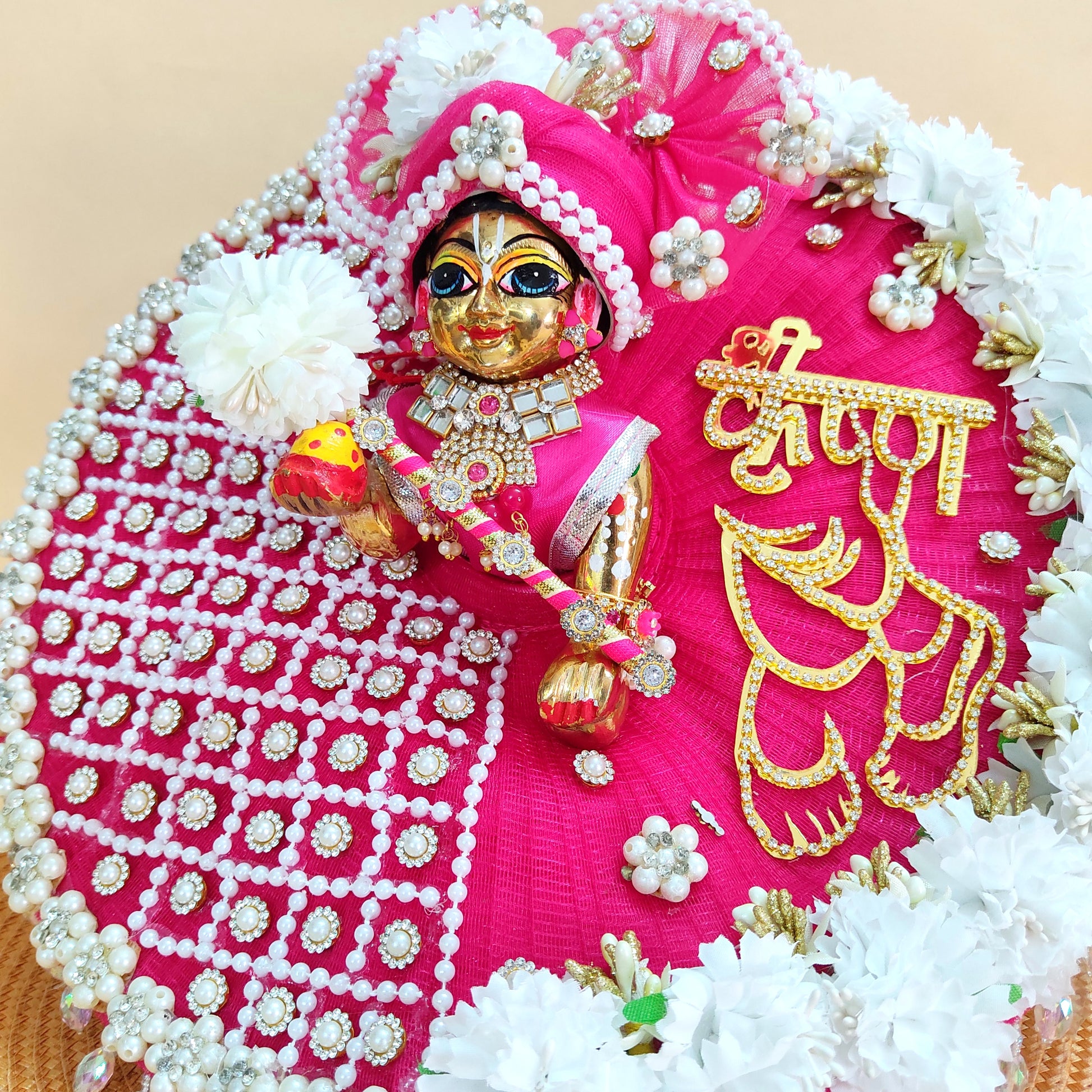 Celebrate the divine presence of your Laddu Gopal with this Pink Designer Dress featuring a handmade patch beautifully inscribed with “Shree Krishna” in golden work, accompanied by His sacred charan (footprints). The patch is adorned with delicate flowers and bead embellishments, bringing a blend of grace and devotion to your deity’s roop. This poshak comes with a matching Mukut and a complete Shringar set, perfect for Diwali, poojas, or daily darshan. Available in two stunning colors, this outfit is a heartfelt offering of love and artistry, reflecting the eternal charm of Kanha Ji.