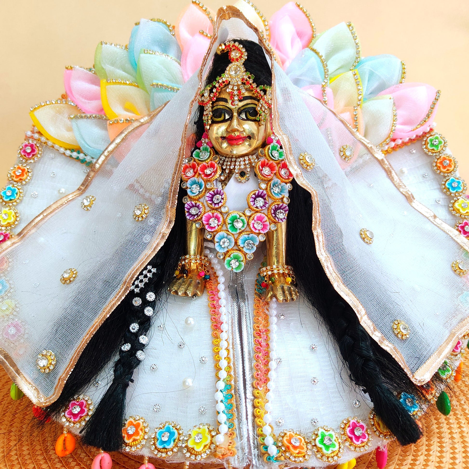 Adorn your Radha Rani in pure elegance with this White Poshak, adorned with delicate multicolor petal detailing and intricate designer lace work. The soft white base reflects serenity, while the vibrant accents add a joyful, festive charm. Perfect for Janmashtami, poojas, or daily darshan, this ensemble includes a heavy matching Chunri and a complete Shringar set—a graceful blend of simplicity and divine color.