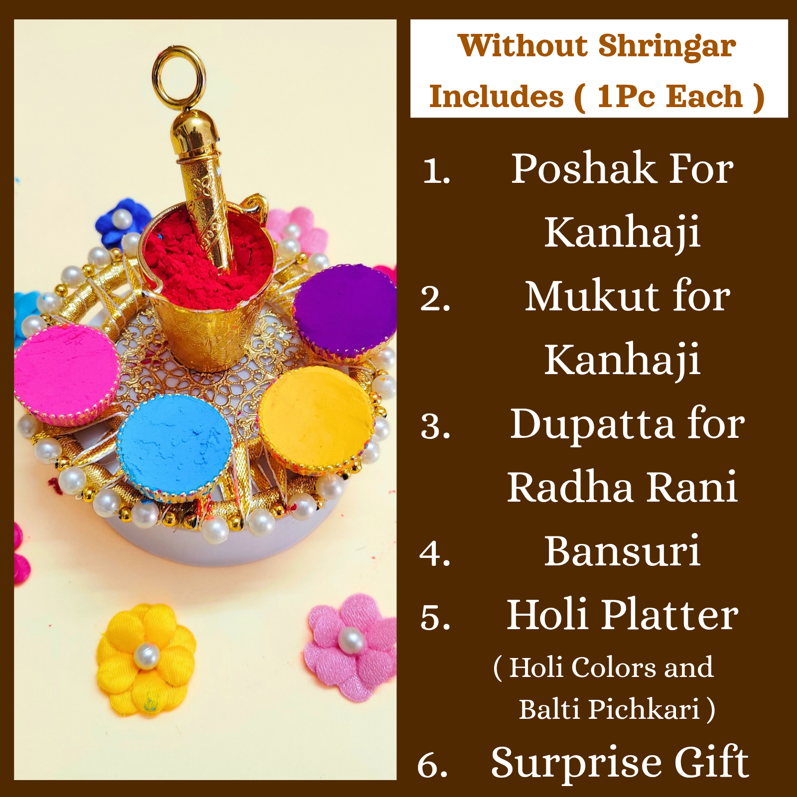 Includes — Handcrafted Heavy Poshak, Mukut for Kanhaji/Chunri for Radha Rani, Matching Bansuri, Holi Platter Set and a Surprise Gift.