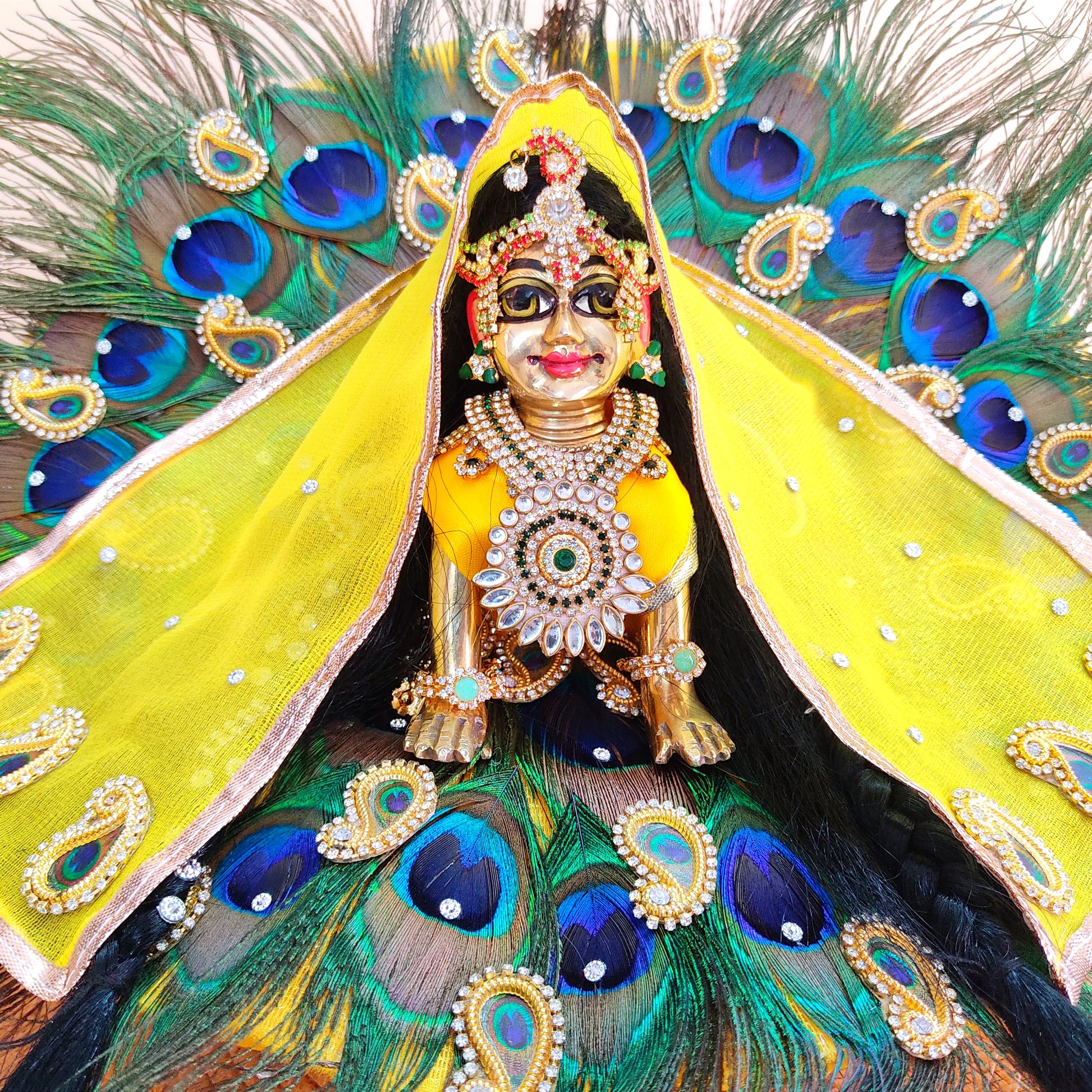 Inspired by the graceful peacocks of Vrindavan, this Peacock Feather Special Poshak reflects the eternal love of Radha Rani, who adored peacocks—and so did Shri Krishna. Adorned with a regal peacock feather Chunri and a complete shringar set, it's a perfect tribute to divine beauty for your Laddu Gopal this Janmashtami.