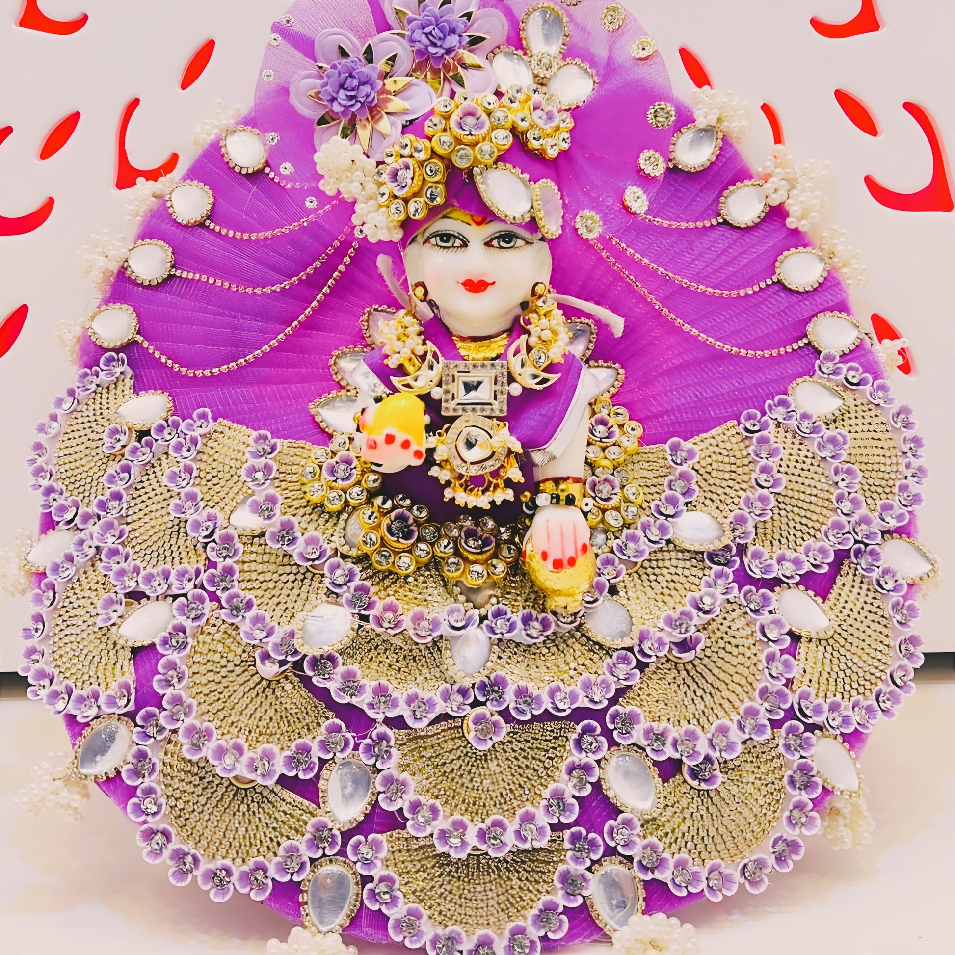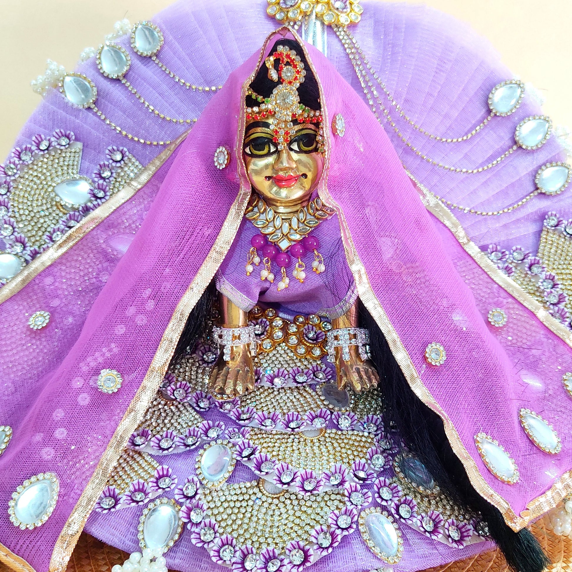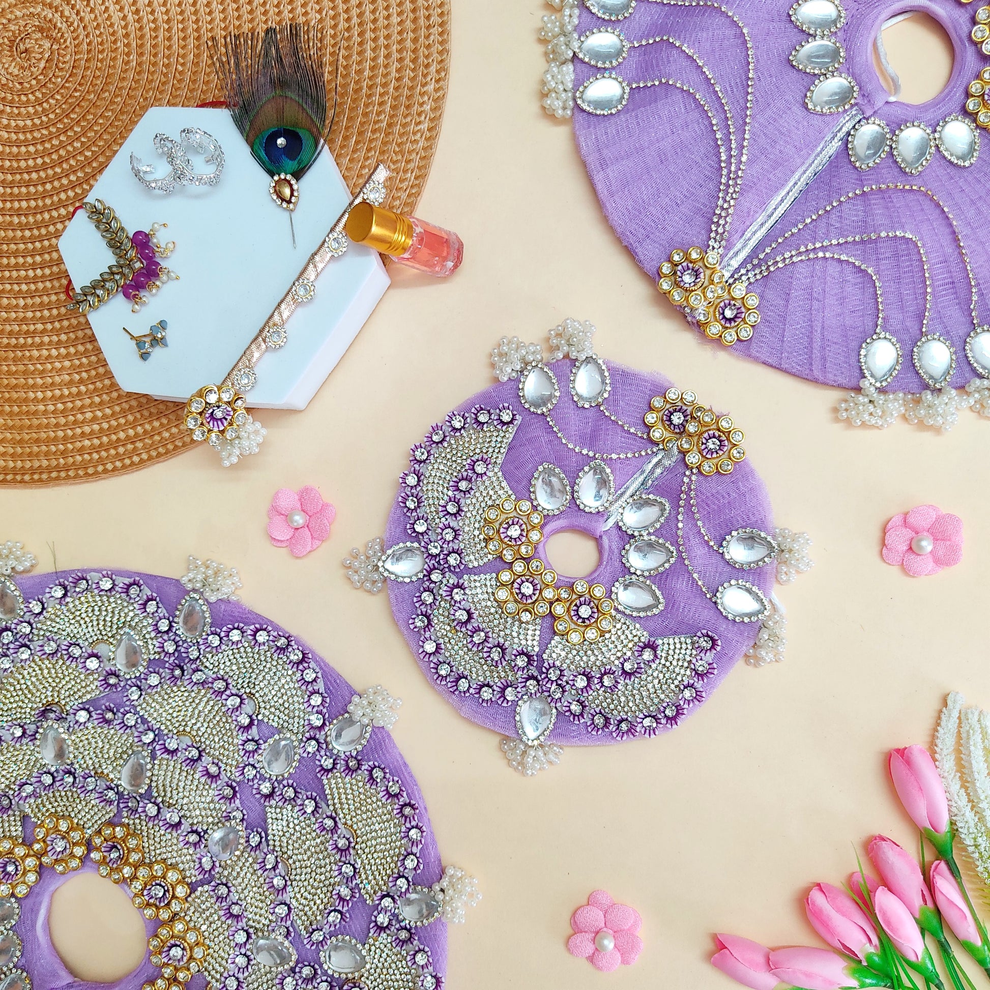 Celebrate Janmashtami with this Sparkling Diamond Finish Radha Rani Dress in Light Purple, featuring handmade patches crafted with diamond chains and delicate matching flowers. A truly unique design, this poshak comes with a matching Chunri and full Shringar set, and is available in six beautiful colors—perfect to make your Kanha Ji shine with divine elegance.