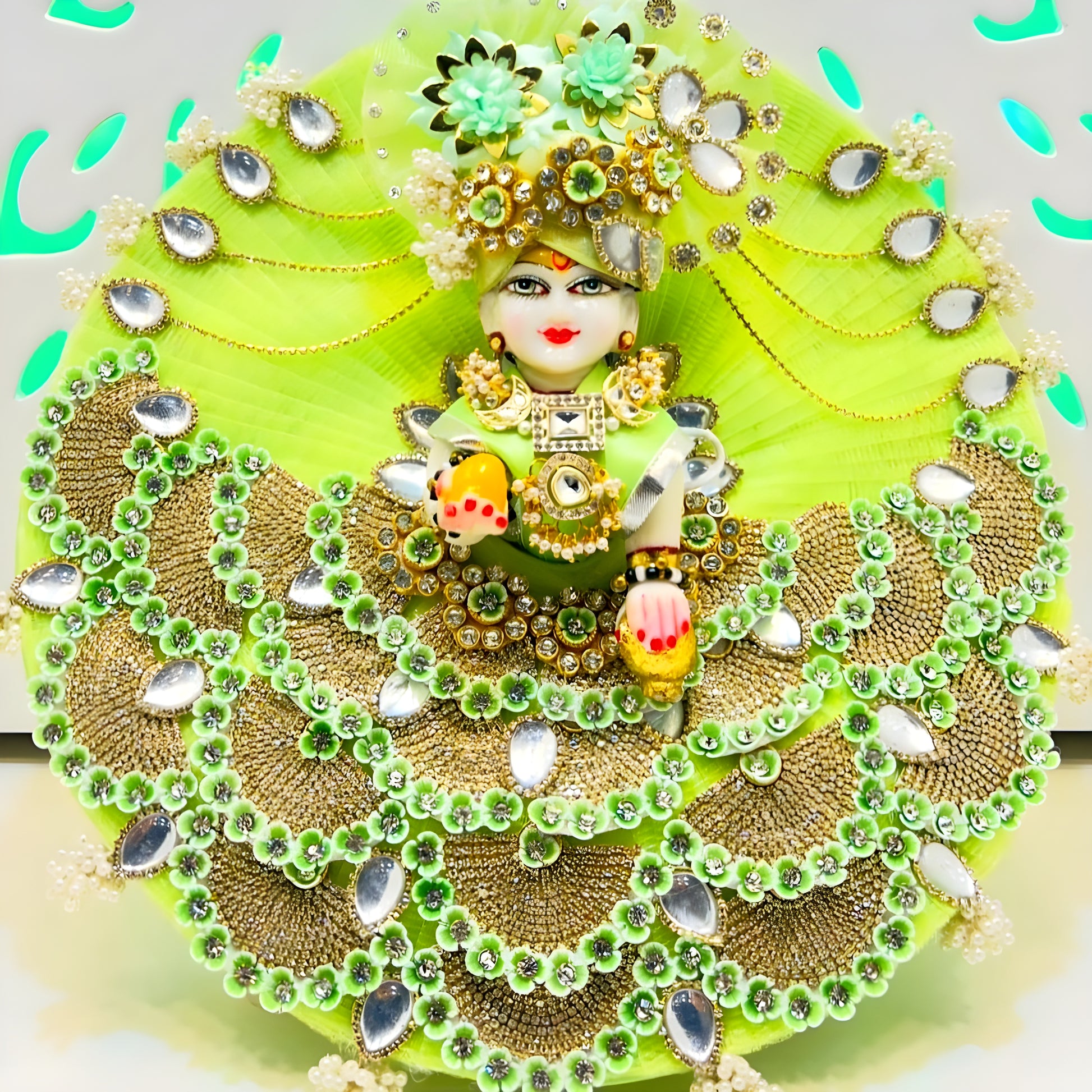 Each set includes — Handcrafted Heavy Poshak (Dress), Mukut for Kanhaji / Chunri for Radha Rani, Diwali Pataka Set, Bansuri, Shubh-Labh Set, Necklace, Bangles, Earrings, Aromatic Perfume, Elegant Peacock Kalgi, and a Dress Cover for protection.